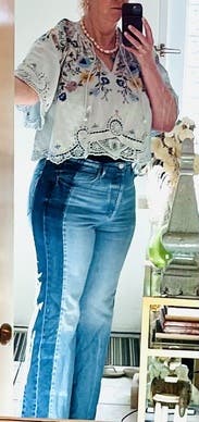Initially, I thought there was too much material and I was lost it in - but the color and the embroidery are beautiful. I got many compliments on it. It is short waisted, especially for those of us that are taller - but cure with high waisted jeans.