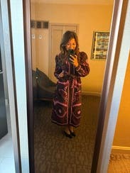 This was a bit outside my comfort zone, but was perfect for hosting a baby shower. I was running late and had not even tried it on before I left. Luckily, it fit perfectly. I am in between a size 8 and 10, but the large was needed for my bust and shoulders.