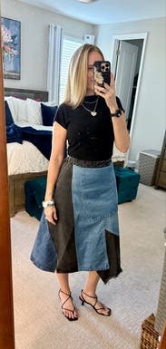 This denim skirt is such a unique and eye catching piece. I loved being able to style it both for work and running around town. Received a ton of compliments. The fit is perfect and would work for a lot of body types.