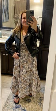 Wore this transitioning into fall with a jean jacket and boots. I received many compliments. Cute, comfortable but shapeless. This brand seems to run a little large on me so I'd size down for a more fitted look.