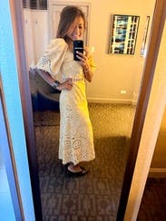 This dress is amazing! The yellow is on trend and I love all of the eyelet cut out details! Will rent again!