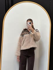 The Sea New York Linea Fairisle Knit Combo Fleece Jacket is a stylish piece with a plush fleece body and a fair isle knit panel. For a versatile look, wear it with jeans for a casual outing or with trousers for a more polished look.