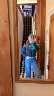Loved this with jeans! The sweater dresses up any vibe - the texture of the wool is a little uncomfortable for me so that's why i gave it 4 stars - very thick warm sweater- great holiday vibes!