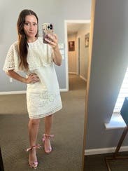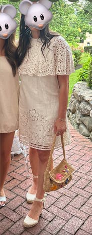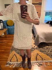 I echo the sentiments of other reviewers about this dress. Am I wearing a table cloth? Is this chic and Provençal? Is this matronly and fussy? I don’t know. I vacillated the whole time I was wearing this dress. Pros: It is very comfortable. I’d say it runs slightly large. I’m in an XS and I could probably take in two inches on the waist- but the looseness keeps it easy and effortless. The draped capelet made it interesting enough it needed very little styling. The fabric is 100% cotton so it’s very breathable, even though it is fully lined. It was not see through which is rare for white! Cons: This is not flattering for curvy figures. The cut of the dress is literally a rectangle. The cape on top adds volume so if you are broad shouldered, or big busted I think it will be awkward. There are no pockets, and it does wrinkle quite quickly. All that being said, I wore it a couple of times. It was easy to throw on with sandals. I think you could probably dress it up with heels but that kind of defeats the point of the dress to me. It reads as an improvised shift made from a table cloth and gives off a laid back air of “I don’t care about your opinions”.