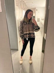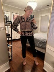 Loved wearing with a pair of bootcut jeans & heels. Super cute and festive.