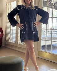 This dress is precious and quite short. Also, be advised it has “SEA” embroidered on the back of the sailor collar. It’s in navy but it’s definitely there.