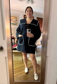This dress is very cute. I’m not tall and it was definitely a little short for my comfort level but loved the ties on the front and the big collar