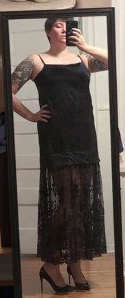 Yes, there’s a 20-something Goth Girl living in my 🖤 I find it difficult to resist black lace. To give this a little more shape, I sized down from my usual 4 to a 2 and it worked out perfectly. Just enough room for my 32DDD’s and my 36” hips. Of course it’s a midi on the model and a maxi on me (5’2”). The body of the dress is a medium thickness and easy to wear as it’s not at all clingy. Works with a moderate heel or flats. Thinking I could add a leather jacket and boots for a more edgy look during cooler months. Love this brand and would def recommend.