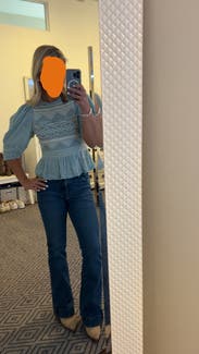 This blouse is adorable and I received many compliments on it! I ended up tucking it into a pair of paper bag drawstring waist shorts (also from RTR) for a daytime look. I also paired the shirt with white jeans.l but I didn’t get a picture of it. The fit is good and does have some stretch from the texture/elastic in the bust. I didn’t iron the sleeves out to keep from being too large. Would recommend and rent again!