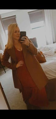 Loved this dress. High quality fabric, nice open back element, and great color that could work for fall, winter and into spring. I wore it at 21 weeks pregnant and if I wanted to, I could show off the bump, but it also didn’t emphasize it.