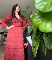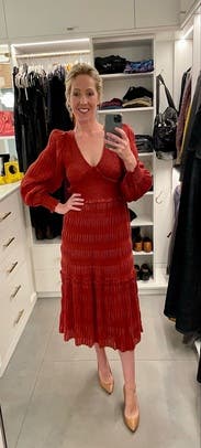 This dress was fun to wear! I’d never buy it so it’s the perfect rental. The back tie is nice for adjusting to size. I felt like a Christmas ornament and wore this for a Christmas party. Warm but not too hot, and the fabric was not itchy. The puff sleeves and tiered ruffled skirt were interesting details.