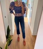 This top is so incredibly sweet! The colors, cut, and pattern are perfect. I’m obsessed with the generous puff sleeve, too. It is definitely on the short side - even with my highest rise jeans, there was a peek of midriff. So maybe not work appropriate IRL… but perfectly fine for WFH video calls! Lots of compliments!