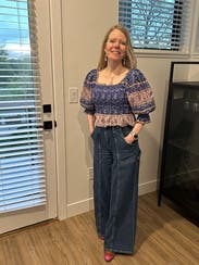 This top was so fun!! Colors and patterns are great and the sleeves make a statement. I’m 5’1” with a short torso and the length worked great with high rise pants.