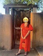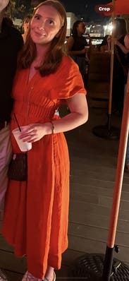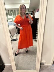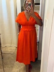 This dress was a total standout. The coral-orange color was vibrant and fresh, and the silhouette was both flattering and comfortable. I loved the cinched waist paired with the flowy skirt — it created shape without feeling restrictive. It’s one of those easy-to-wear pieces that makes you look instantly polished while still feeling effortless.