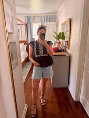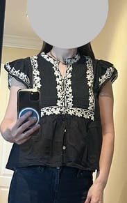 This top was so delightful and really on trend. Looked adorable with khaki linen ankle pants and slides. I would have loved to have kept it longer, but every other item in my order didn't fit, so I decided to send the whole lot back and start over (disappointing). Rent this - if you can get your hands on it the rest of the season!