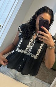 This is a cute breezy top though I wish it was a smidge longer... the proportions just felt a little off. I wore a black cami under to balance things out, and also was good since there are gaps between the front buttons.