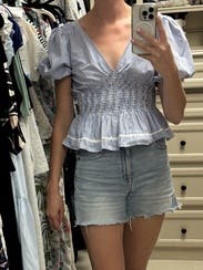 Such a fun top! Loved wearing this with white shorts for a casual Memorial Day BBQ. Also looked great with white jeans and wedges. TTS but definitely low cut.
