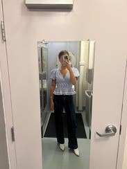 Slightly cropped, so wore with high waisted jeans. Worked with a standard bra for me which was a nice surprise given v neck and back. Great summer option- the blue and white stripes and white trim detailing really worked without feeling too fussy.