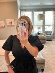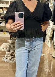 Great quality top with beautiful eyelet detailing! The design is lovely, and the fabric feels high-end. It was a little low-cut for my taste, but since I had purchased it, I added a quick stitch with black thread—and it worked perfectly. This top pairs well with everything, but looks especially beautiful with the matching shorts for a perfect set.