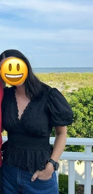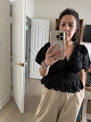 Very cute and unique, was a bit lower cut in the front and back so didn’t wear to work like I was thinking but a great summer shirt for dressing up a bit. A little puffy in the bust