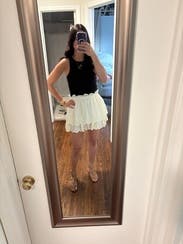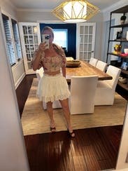 Loved this little number. Good length and stayed down in the wind because of how it’s constructed. Really cute and not at all see through because it’s about 3 layers in total.
