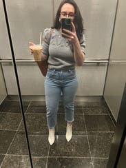 I’m a small in sweaters, and I went with the medium, which was snug but fit. It’s definitely a cropped sweater—I wore with high waisted pants, otherwise I would have been showing my stomach all day (not a good look at my office!) All if this said, it’s a very cute sweater!