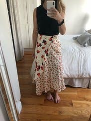 Cute skirt I wore to a bridal shower. It's got a fun pattern and asymmetrical line, but the waist was very tight and a bit hard to tuck a shirt into it.
