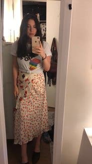 Was a nervous renting this cause I didn't know how to style it. But got a little creative with a graphic t. This skirt fits great. Veryyyy flattering and great material.