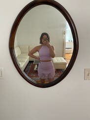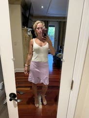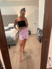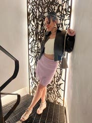 Wore this skirt with a white top and it was very cute! A fun color and comfortable. Very stretchy material and form fitting. Happy it wasn't too short because I run into that problem sometimes, but felt very comfortable in this one