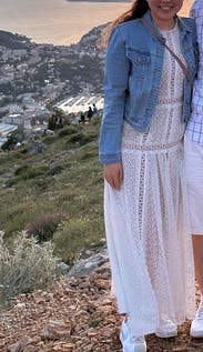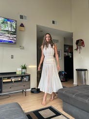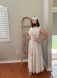 It was perfect and airy for an outside summer dinner party. The only issue I had was the armhole gaped a little, but I just wore a strapless bra and still wore it to the party. The underlayer is nude and above the knee, so it’s flirty but the high neck still felt modest. Full length which for some reason I had expected midi length. Could not zipper by myself not because it was too small, just stiff.