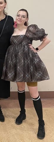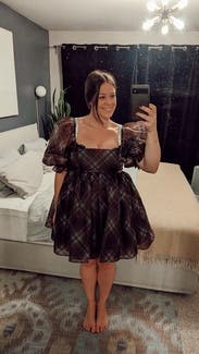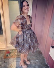 Gosh, this is a dress that I would never buy, but I sure as heck would rent it. Such a fun silhouette, and I loved the neutral colors and the plaid. Extremely striking, I got compliments everywhere I went. I am 54, and it was a tad short, so I just wore biker shorts underneath. fun, fun, fun!