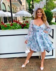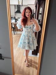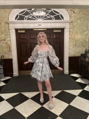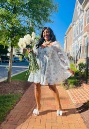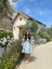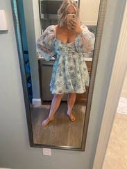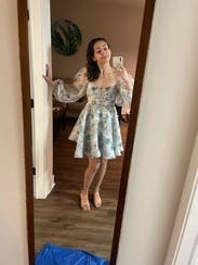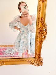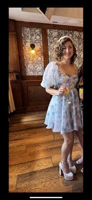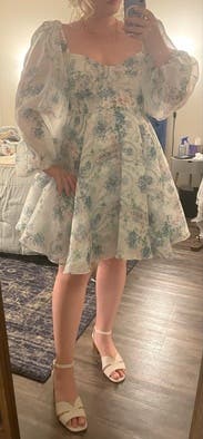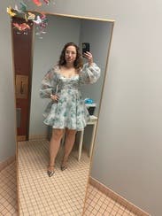 SUCH a cute dress omg I have never felt prettier. And it looks 10x cuter when you really lean into it and get pastel/floral accessories too! I will say the fit was a little off, but that's more my fault. They didn't have an XS available, which was closer to my measurements, so I had to go with the XXS. I was able to squeeze into it, but I just couldn't take a deep breath, especially once I started eating. If you're like me have a wide ribcage but a flat chest, I would definitely size up because it's more of a babydoll waistline and doesn't sit on the smallest part of your waist. Still, I'm obsessed and this dress got me so many compliments :)