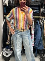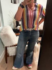 This is a fun, interesting, colorful top. That looks really cute with jeans. It was comfortable and I got a few compliments on it.