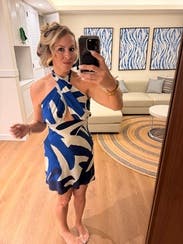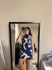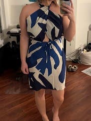 This halter dress is barely there—in the best way. Light as air, bold as hell, and made for summer nights. The blue print pops (there’s no black in it- that’s navy) the fit’s perfect, and the vibe? Effortlessly chic. You might need some fashion tape to hold the fabric down in the front if you want to wear a stick on bra. But you can easily go without. Very true to size.
