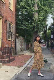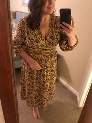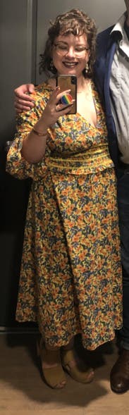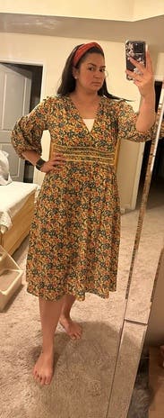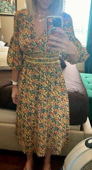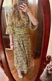 Loved the shape and fit of this dress. Neckline and ruched waist gave a really nice shape up top and was flowy over my stomach which was cool for a wedding with a ton of food! Could skew more casual with sandals/flats if you wanted but it does show a good amount of boob if you're bigger up top like me.