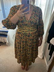 I ordered this in a 10 and 12. I tried both on and they fit pretty much the same. I wore the 10. I love how this dress has vintage vibes with the middle cinching, puffed lower sleeves, a-line fit and floral print! I was so comfortable in this dress the whole night. I would love to rent it again!