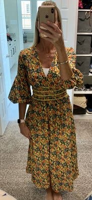 I loved everything about this dress! The v-neck is a little low (so maybe wear a cami underneath if you are wearing to work), but it is very light and comfortable, good material (100% cotton), and the floral pattern is absolutely beautiful. Fun balloon sleeves! I usually wear a 12, but went with the RTR recommendation of size 10R and it fit perfectly. The waist has an elastic band so it can stretch out.