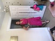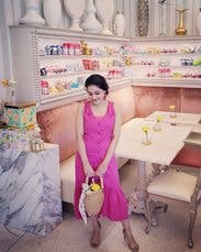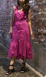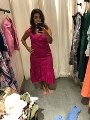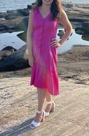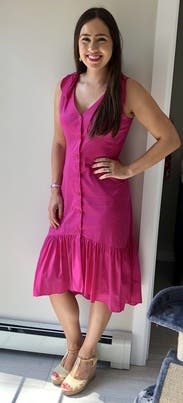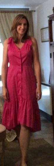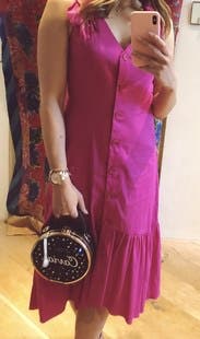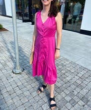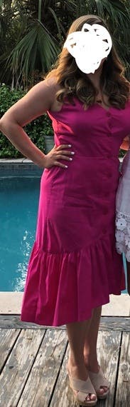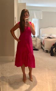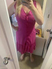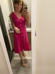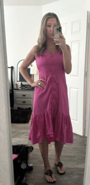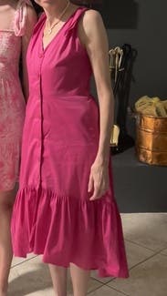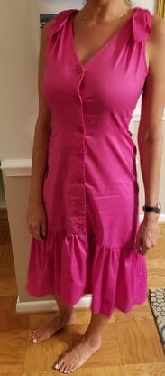 Not my favorite color on myself, but definitely got lots of compliments on this bright pink dress on a gloomy summer day! Very comfy and breathable fabric - unfortunately the top button left a little gap because of my bust; but this was a good rent.