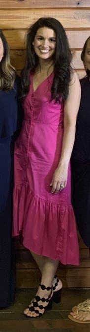 I loved the vibrant color and easy material of the dress! It has a nice silhouette that gently highlights your curves without being too tight or clingy - great for a hot night. I particularly liked how the straps hit right where my shoulders meet my body at the outside edge of my chest, without curving inward like so many straps do. The dress fit comfortably true to size for me but gaped in the chest - I had to safety pin it between the first two buttons. I would rent it again!