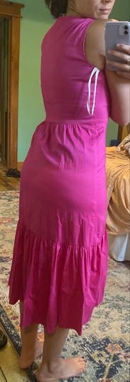 O would say this dress runs a little big I belted it at the waist to give myself more shape it was baggy The top was fitted but I am busty Had a Spanish vibe which I digged Such a bright pink perfect for summer Wrinkles a bit throughout the day- be mindful of that Overall pretty summer dress