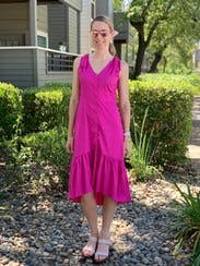 This dress is great and flattering! Fits true to size. The magenta color is so pretty. It does wrinkle pretty easily.