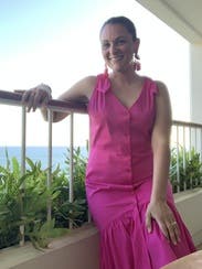 Pink cotton (63% Cotton, 37% Polyester). Hourglass. Sleeveless. V-neckline. Exposed front button down closure. 47" from shoulder to longest hemline. Imported.