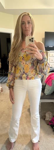 I wish I could buy it if it were less expensive to buy. Great off shoulder top for summer and spring that’s easy to work with pants or skirts.