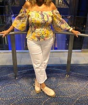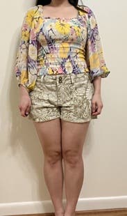 Little self conscious in the gathered top emphasizing the bust. Wore once on a vacation. Loved the color and fabric. Very pretty bout probably more attractive on smaller bust line.