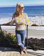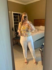 I wish I had a better picture of me in this top, because it was so cute! I was worried it was going to show my stomach, but with my high rise jeans it didn’t at all. The sleeves are sheer and flowing. The rest of the top is ruched and tight. I felt it was flattering, but might not have 6 months ago while postpartum. Paired well with wedges and strappy sandals. Overall really loved this top.