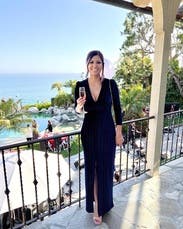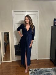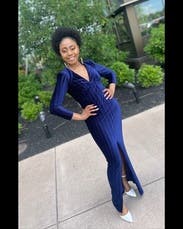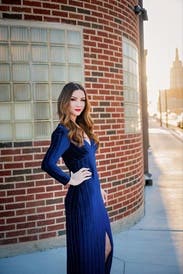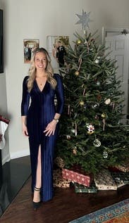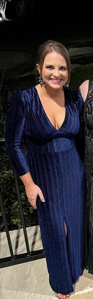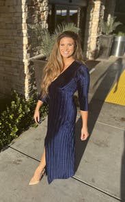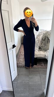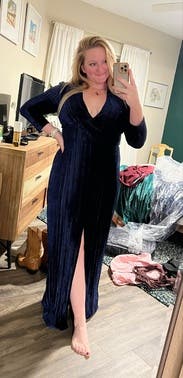 I’m kicking myself for not getting a better picture of me in this with my glam done!! I rented this for my office Christmas party and it was an absolute showstopper. It fit perfectly and ran true to size. It definitely shows off the girls, so if that’s something you are uncomfortable with, this is not the dress for you. I was worried that the column style gown would not give me any shape, but I was completely wrong. I wish I had more reasons to rent this dress.