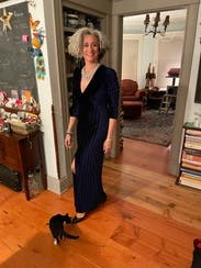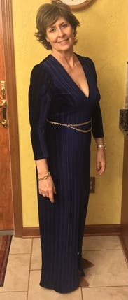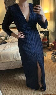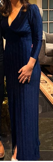 Beautiful velvet dress for a winter wedding. Rich dark blue color. Fairly low cut, gorgeous center slit. Velvet ribbing is flattering and smoothing. Shaping enhances hourglass figure.