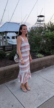 Out to dinner with the hubs. Flattering but plenty of room for desert! Straps not adjustable so they hung a little long on me but it worked.