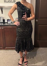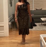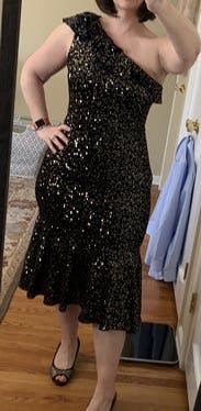 Pictures hardly do this dress justice. It has tiny gold sequins for all over sparkle and perfect fit 0p, midi dress but hits as formal length.