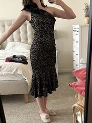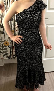 This dress was great for me since I'm short - it was more than tea length and super comfortable. I worry the one shoulder and ruffle will look dated in the future (don't care too much about that) but it was great for a charity ball. Wore a normal strapless bra and any strappy black heel works!